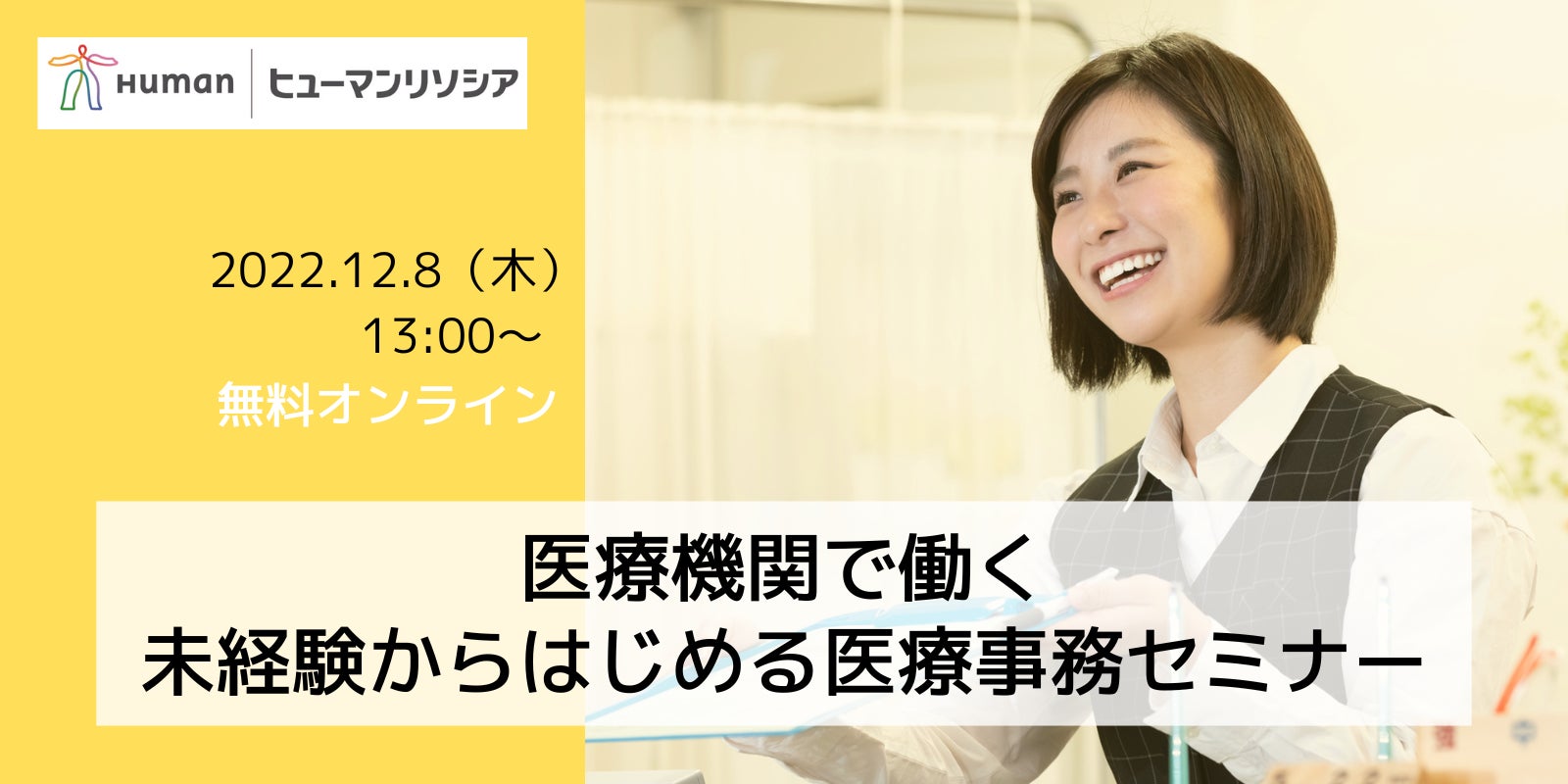 総合人材サービス会社のヒューマンリソシア株式会社(本社:東京都新宿区、代表取締役:御旅屋 貢、以下「当社」)は、未経験から医療事務にチャレンジしたい方を対象とした無料セミナー「医療機関で働く~未経験からはじめる医療事務セミナー」を、12月8日(木)13時より、オンラインで開催します。これから需要が高まる医療事務の仕事について、医療業界の実情とともに詳しく解説するほか、キャリアアドバイザーによる無料相談会も実施し、未経験からのキャリアチェンジをサポートします。