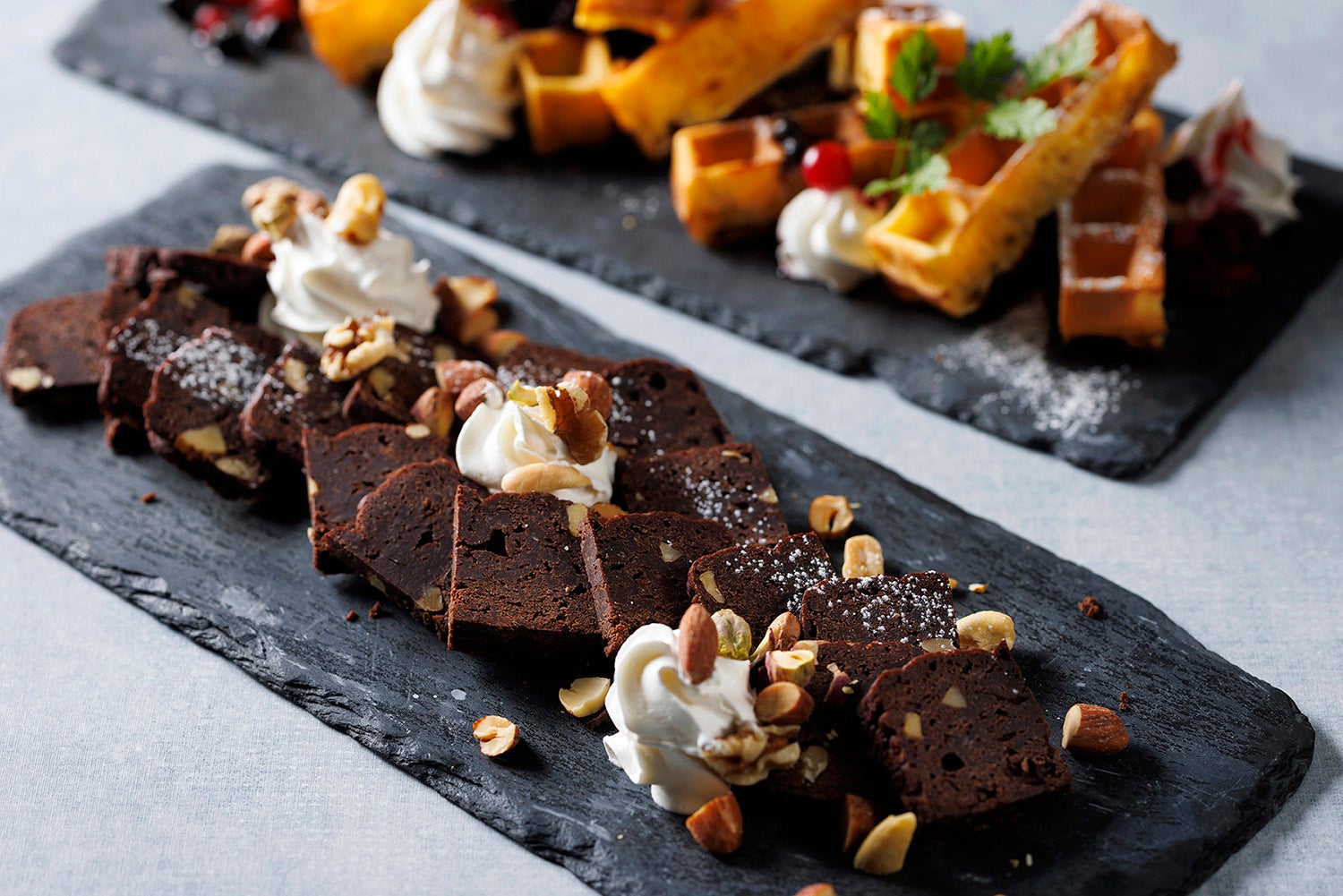 自分で作るオリジナルパフェ、チーズケーキ、チョコレートブラウニー、フルーツポンチ、ワッフル 他