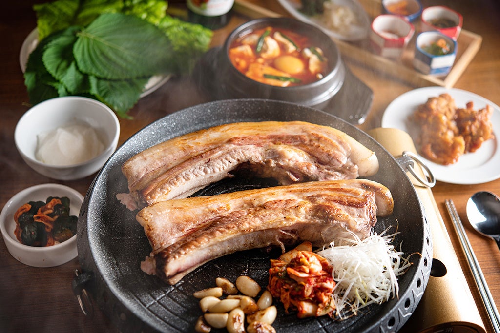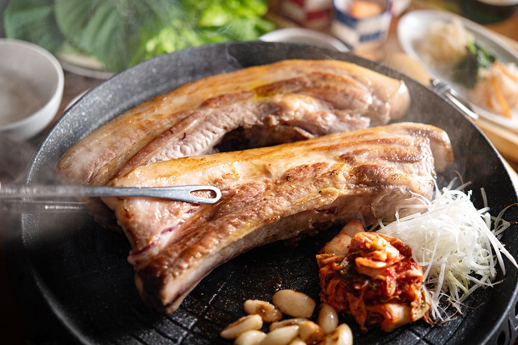 国産豚の骨付きバラ肉を贅沢に使用した王道のサムギョプサル。「ラッキーソウル」では、お肉をお客様に選んでいただき、その重量で値段が決まる量り売りです。焼くと余分な脂がほどよく落ち、焼き上がりは、脂身はカリカリ、肉はジューシーで濃厚な味わいに仕上がります。キムチやにんにく、白髪ねぎと一緒にサンチュで巻いて食べるのが特にオススメ。