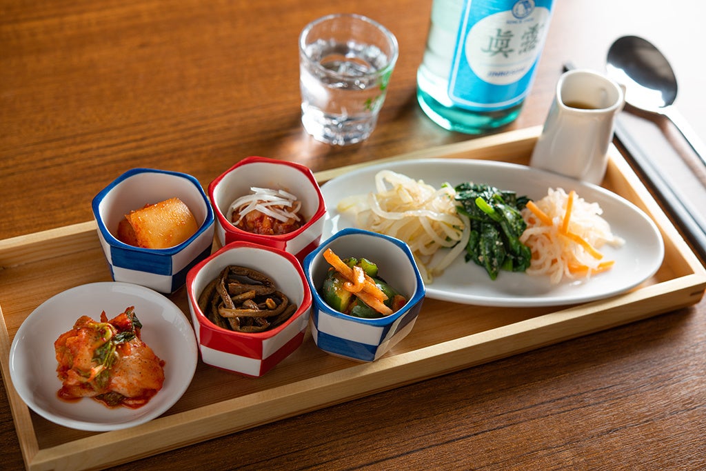 4種のナムルとキムチ、韓国のりなど、野菜たっぷりで栄養バランスもバッチリな定番韓国ご飯。熱々おこげがたまりません。