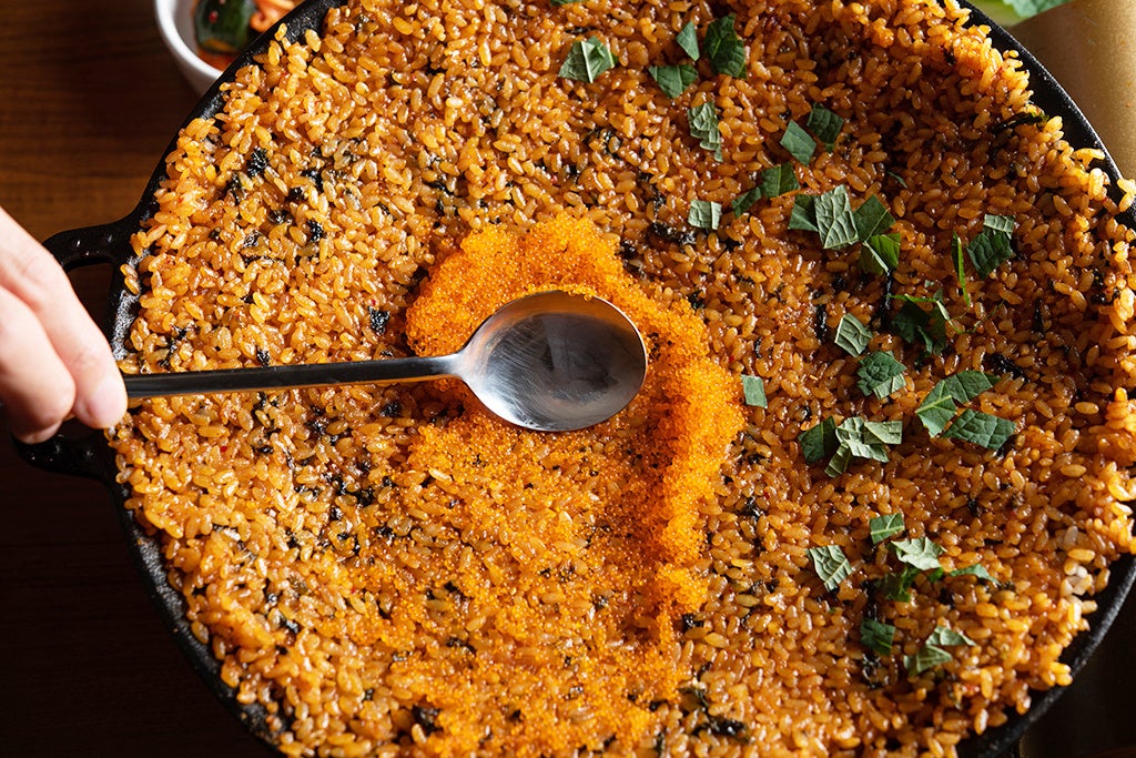 「チュクミサムギョプサル」の〆といえばこちら。イイダコと豚バラの旨みをたっぷり吸ったスープにご飯と韓国海苔を加え、鍋肌に焼き付けなから炒め、最後にとびっこと刻んだえごまの葉をまんべんなく散らして完成!モチモチのご飯とカリカリおこげ、プチプチしたとびっこの食感が絶妙な極上〆飯です。