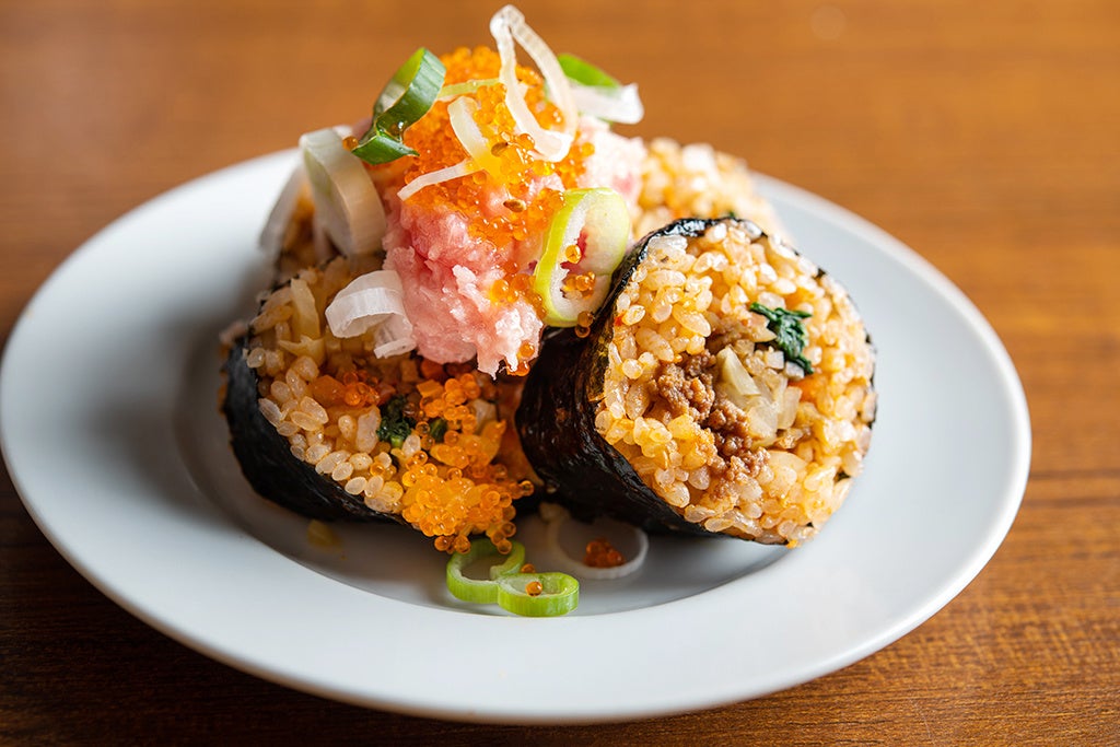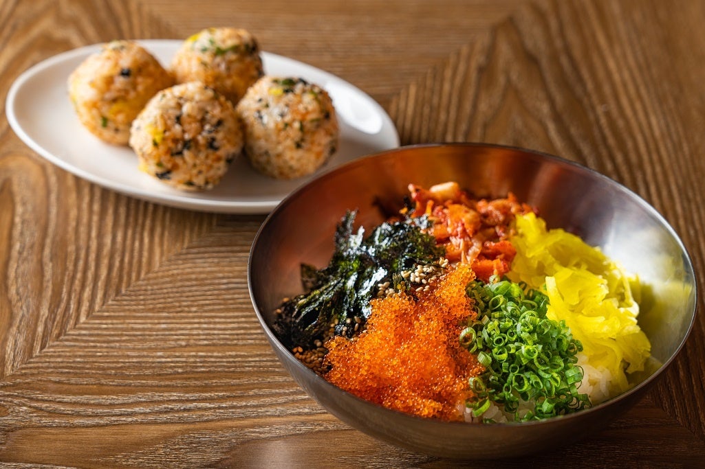 とびっこ、キムチ、韓国のり、たくわんを混ぜ合わせる日韓融合おにぎり。お客様の手でお好みの大きさに丸めてパクッとどうぞ!