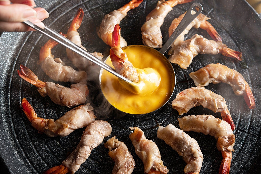 ぷりぷり食感の海老に、ジューシーな豚バラ薄切り肉を丁寧に巻きつけて具材にした新ジャンルのサムギョプサル。鉄板の上で一緒に温めるチーズソースと絡めてお召し上がりいただきます。海老と豚肉の甘くて濃厚な旨みに、とろーりとろけたチーズの塩気が加わり、メインとしても、おつまみとしても、美味しい逸品です。