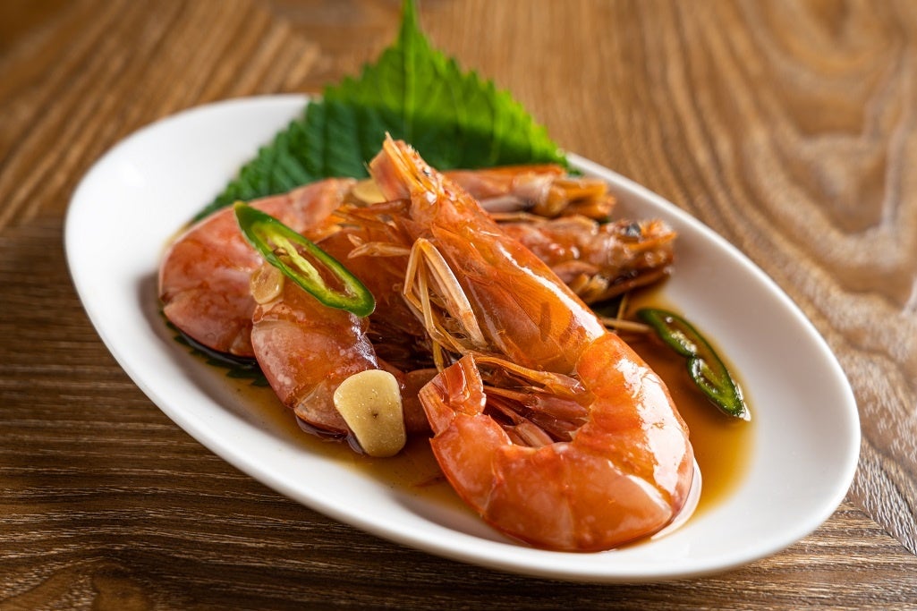 にんにくと唐辛子が効いた特製の漬け込みダレが海老の甘さを引き出しています。