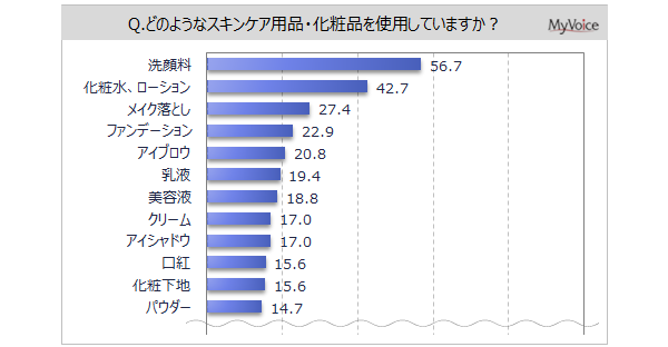 使用しているスキンケア用品・化粧品は(複数回答)、「洗顔料」が56.7%、「化粧水、ローション」が42.7%です。