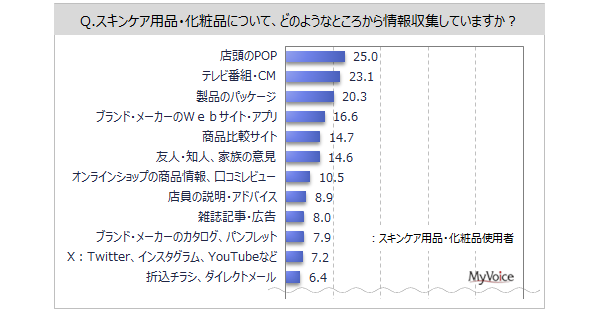 スキンケア用品・化粧品の情報源は(複数回答)、「店頭のPOP」「テレビ番組・CM」「製品のパッケージ」が使用者の各20%台です。