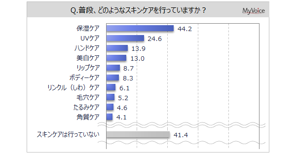 ■行っているスキンケアは「保湿ケア」が4割強、「UVケア」が約25%、「ハンドケア」「美白ケア」が各1割強。使用しているスキンケア用品は「洗顔料」が6割弱、「化粧水、ローション」が4割強
