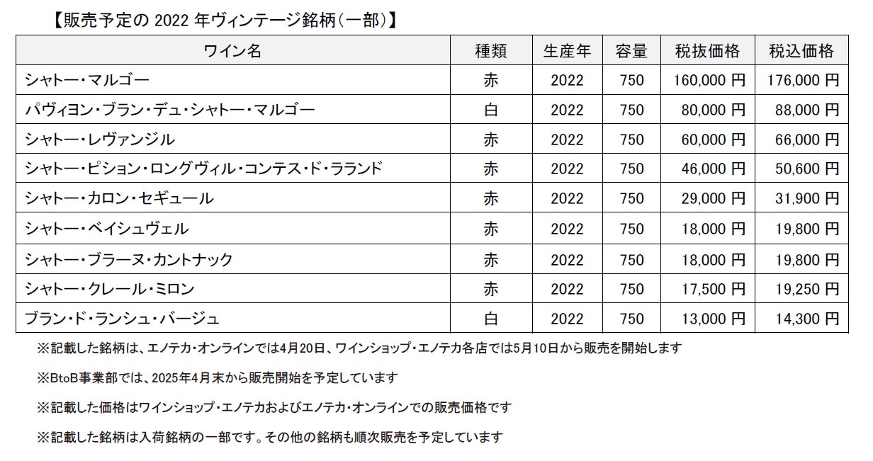 「シャトー・マルゴー」や「シャトー・ピション・ロングヴィル・コンテス・ド・ラランド」をはじめとする「2022年ボルドー」を、4月20日からエノテカ・オンラインで27銘柄、5月10日から全国のワインショップ・エノテカ各店で45銘柄を順次販売開始します。特設ページでは各シャトーによる2022年ヴィンテージの魅力やおすすめのワインを紹介します。今後も準備が整い次第、「2022年ボルドー」の他銘柄を順次販売し、4月から9月頃までで計88銘柄を販売予定です。
