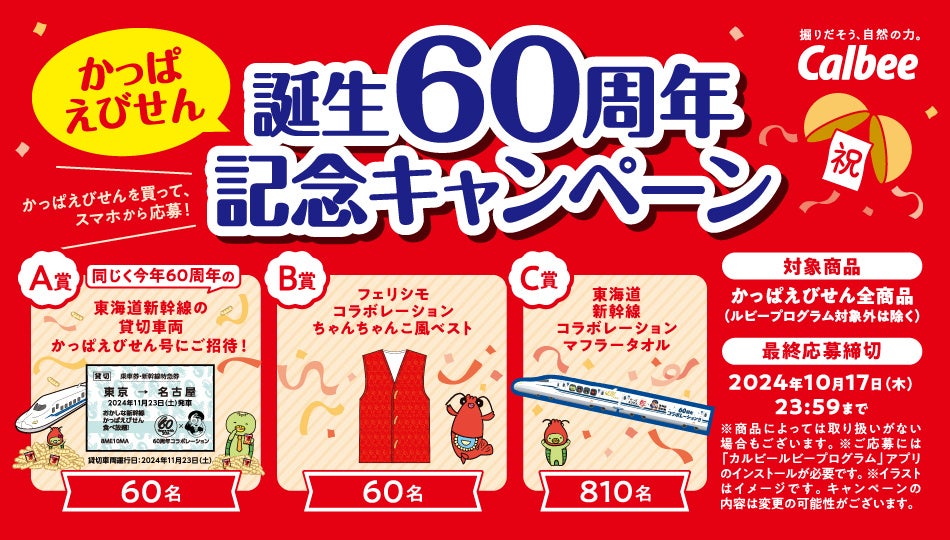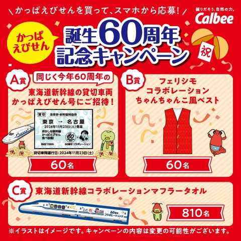 「かっぱえびせん」誕生60周年を記念し、ともに60周年を迎える東海道新幹線やフェリシモとのコラボレーション品が合計930名様に当たるキャンペーンを実施します。2024年7月中旬から、「かっぱえびせん」が順次キャンペーンパッケージに切り替わります(終了後は通常パッケージに切り替え)。
