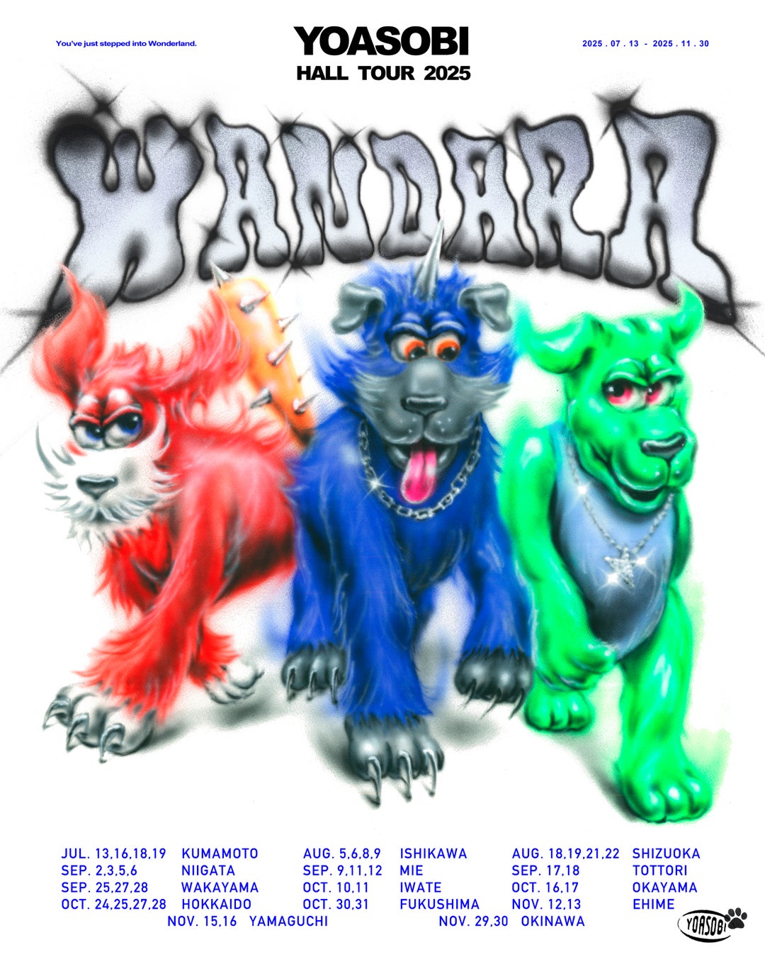 本日公開となったキービジュアルは、エアブラシを用いたストリートな作風で国内外から注目を集めるアーティスト・Ryota Daimonが担当。「WANDARA」という言葉の響きが犬の鳴き声にも似ていることから着想を得て、3匹の犬をモチーフに描き下ろしたイラストをもとに制作されたアートワークとなっている。このユニークなビジュアルを掲げ、YOASOBIが繰り広げる全国ツアーに期待が高まる。