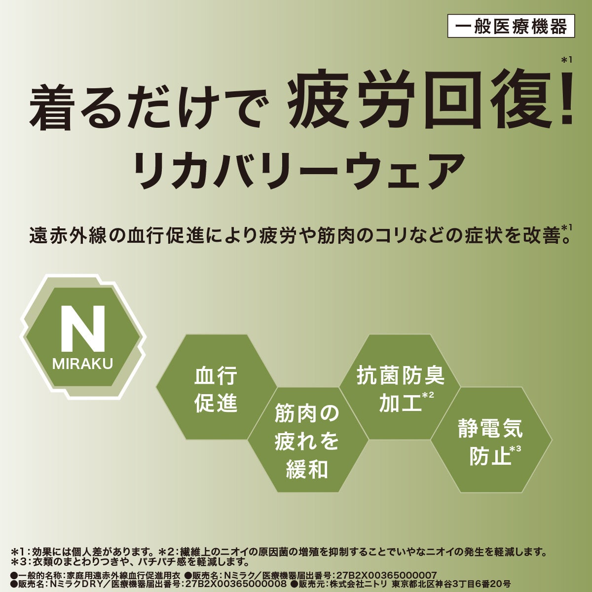 リカバリーウェア「Nミラクシリーズ」は、一般医療機器「家庭用遠赤外線結構促進用衣」届出済衣料です。原材料繊維に高純度セラミックスを定着する加工を施すことによって、遠赤外線の血行促進作用による疲労回復や筋肉のコリを軽減する効果が期待できます。また、抗菌防臭加工(※2)や静電気防止加工(※3)もついており、より快適な着心地でお使い頂けます。