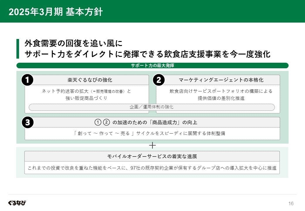 2025年3月期においては、中期事業方針に掲げる黒字化を実現するだけでなく、その後の利益拡大フェーズへの転換を確実なものとすること、また長期視点にたった新たな価値創造のための事業展開を支える安定収益源を拡大することが重要なことから、以下の方針のもと中核事業である飲食店支援事業の成長力を引き上げてまいります。