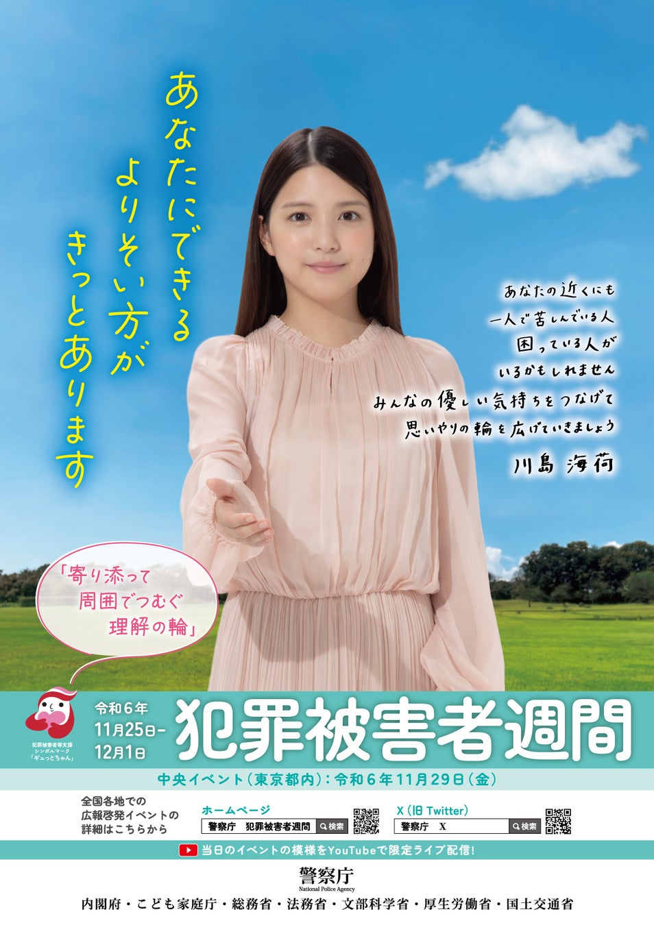 広報事業の一環として、令和6年度は川島海荷さんにご出演いただき、ポスターやメッセージ動画等を制作しました。ポスターは全国の警察署や被害者支援センター等で掲示され、メッセージ動画は警察庁公式YouTubeチャンネル(https://www.youtube.com/@npa9375/featured)で公開中です。