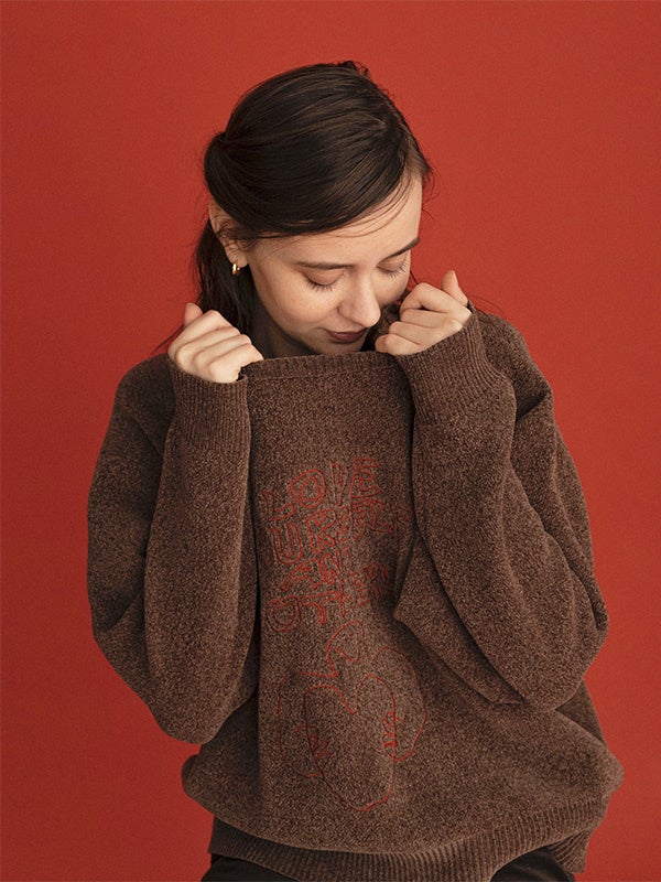 『LOVE』をテーマにオリジナルで描き下ろしていただいたイラストを刺繍したモールヤーンニット。
