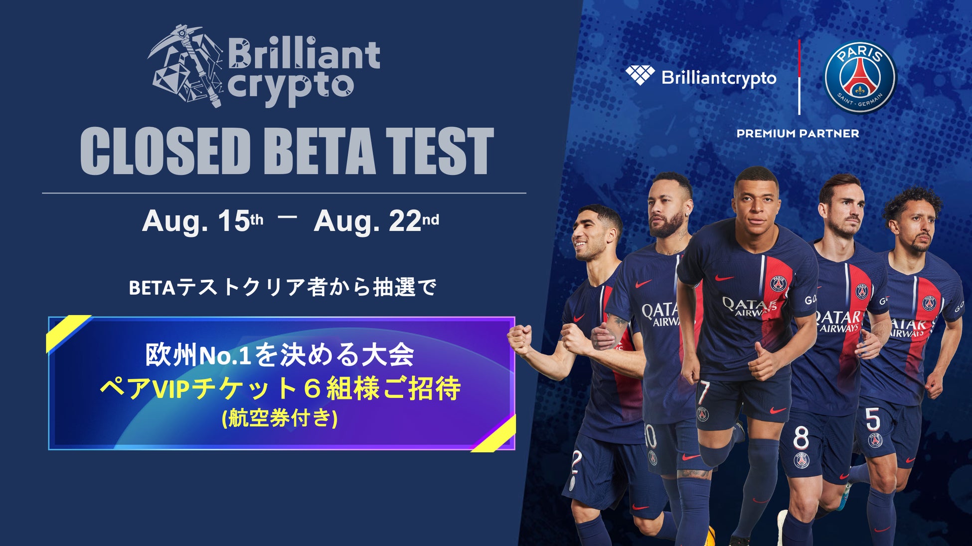 宝石の採掘で利益を得る新ブロックチェーンゲーム『Brilliantcrypto』にて、2023年8月15日から実施するβ版テストをクリアした方の中から抽選で、欧州No.1を決める大会のパリ・サンジェルマンのホーム試合観戦ペアVIPチケット(航空券付き)6組様にプレゼント。