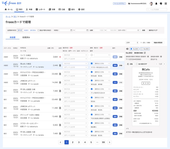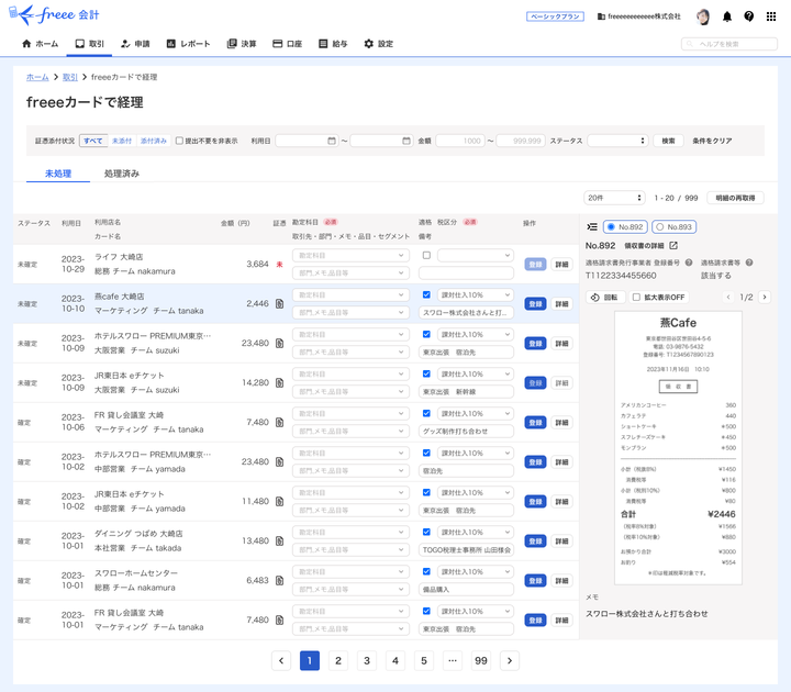 同期されたカード利用明細とカード利用者が提出したレシート・領収書の証憑を確認しながら、一覧画面から取引登録が可能です。