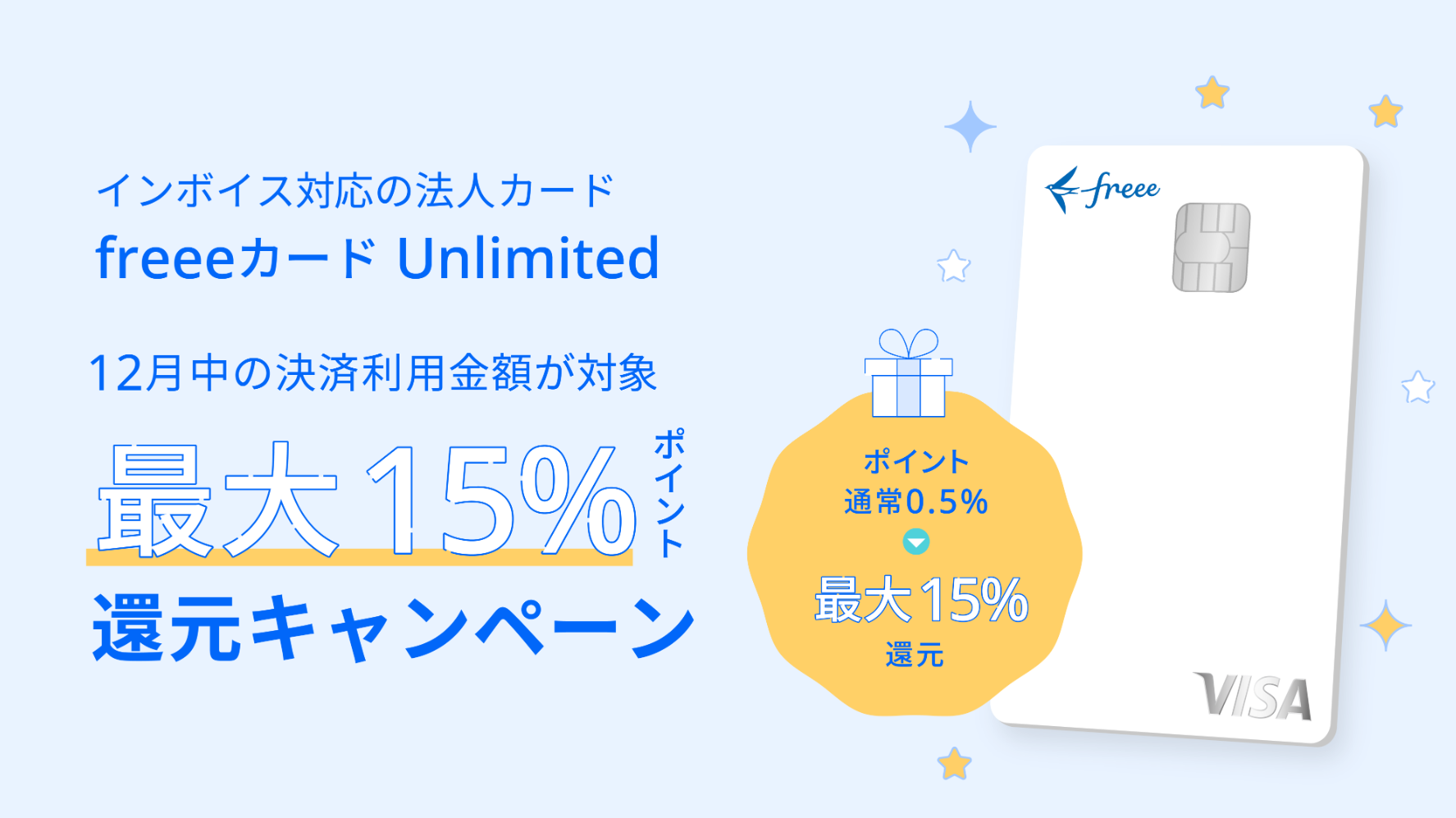 12月中にご利用いただいたfreee カード Unlimitedの決済額に対して、最大で15%のポイント還元キャンペーンを実施します。通常は決済額の0.5%還元(月間決済額50万円未満の場合は0.3%還元*)のところ、12月中の決済利用分については、ポイント還元率が最大15%となります。