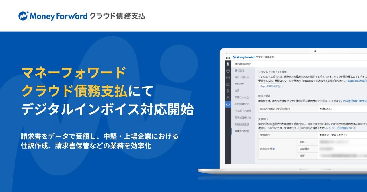 株式会社マネーフォワードは、『マネーフォワード クラウド債務支払』において、デジタルインボイスの対応を開始しました。これにより、『マネーフォワード クラウド債務支払』で、取引先が送信したデジタルインボイスを受け取ることができます。