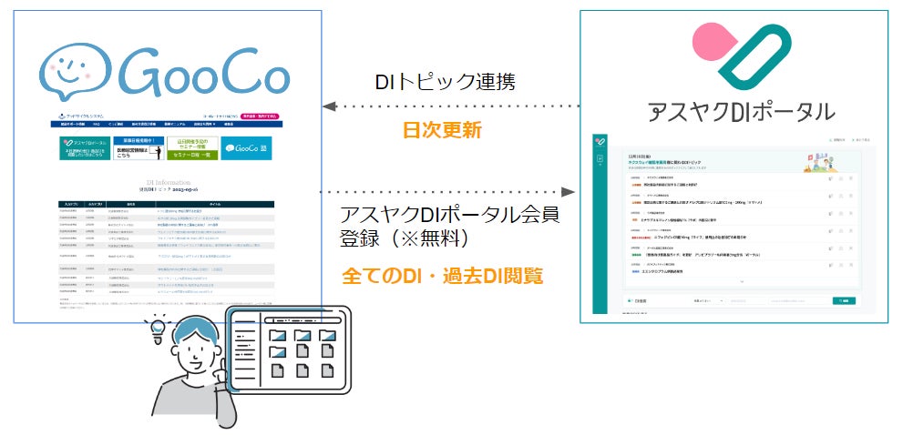 「アスヤクDIポータル」は、薬局・製薬企業間のDIの情報伝達に特化し、100社以上の製薬企業のDIをタイムリーかつ、網羅的に集約し、薬剤師がいつでもどこでも閲覧できるポータルサービスです。「GooCo」にDIトピックが連携されることで、「GooCo」のユーザーである薬剤師は薬歴を使用しながら、効率よくDIをキャッチアップし、コア業務である対人業務の充実化が図れます。