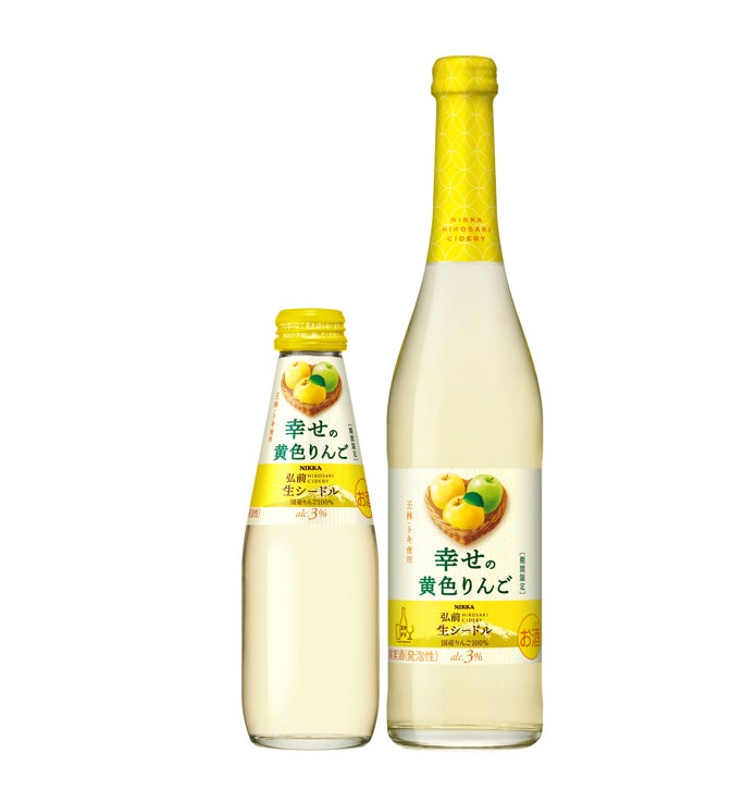 『ニッカ弘前 生シードル 幸せの黄色りんご』は、黄色系リンゴ品種「王林」「トキ」を使用したアルコール分3%のスパークリングワインです。さわやかな甘みと芳醇な香り、穏やかな酸味が特長です。使用品種の黄色系リンゴに合わせパッケージカラーを黄色で統一し、商品の持つ優しさや温かみを表現しています。黄色系リンゴ品種は、果実への日射を遮る葉を取り除く「葉摘み」や、着色が劣る部分に太陽光が当たるようにする「玉回し」といった作業が不要で、リンゴ農家の負担が少ないといわれています。本商品を通じてお客さまへ黄色系リンゴ品種の魅力を訴求し、リンゴ・シードル産業に関わる方の幸せを願い、商品名を「幸せの黄色りんご」としました。