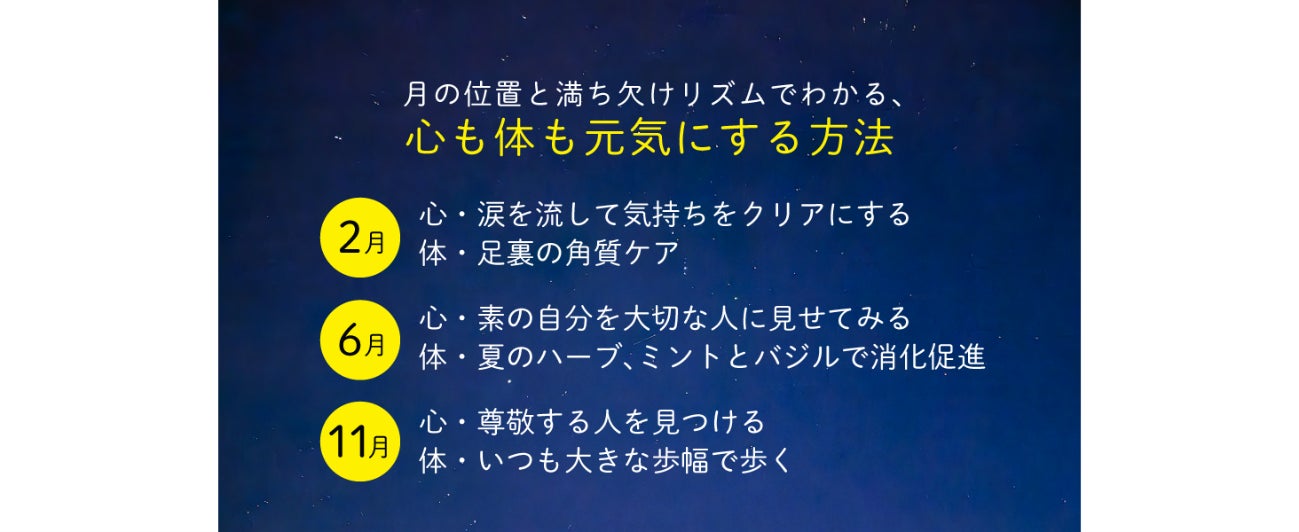 月の満ち欠けが心と体に与える影響は絶大です。本書では、新月、上弦の月、満月、下弦の月それぞれのフェーズに応じた心と体の調律法を紹介しています。新月~上弦の月の時期は「かわる」、上弦の月~満月の時期は「みたす」、満月~下弦の月の時期は「いかす」、下弦の月~新月までの時期は「ゆるむ」をテーマに、心と体を整えて人生をいい方向へめぐらせるために役立つ具体的なアドバイスを提案します。