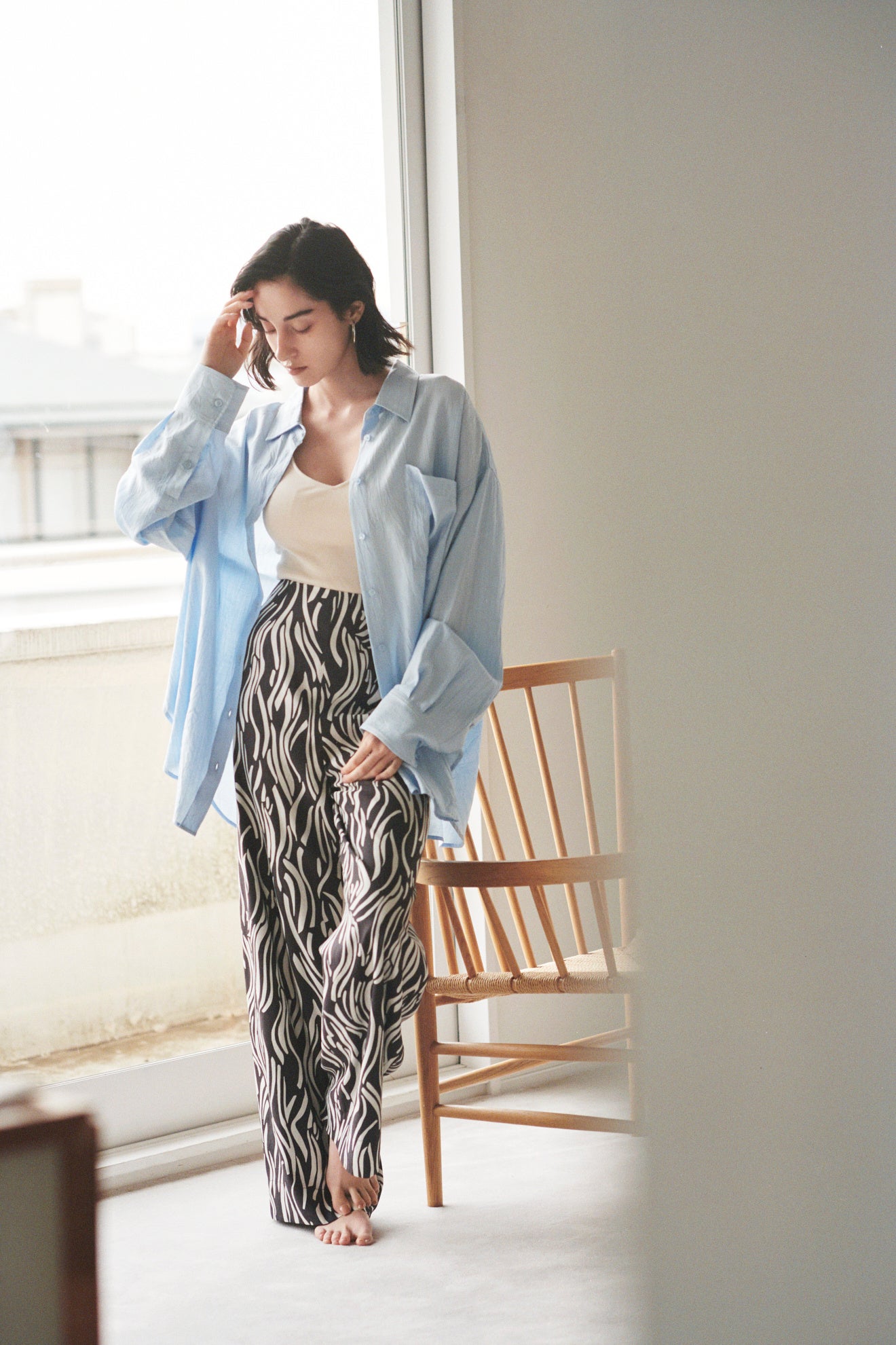 Blouse 15,400yen / Pants 13,200yen / Sandals 13,200yen / Pierced earrings 3,520yen