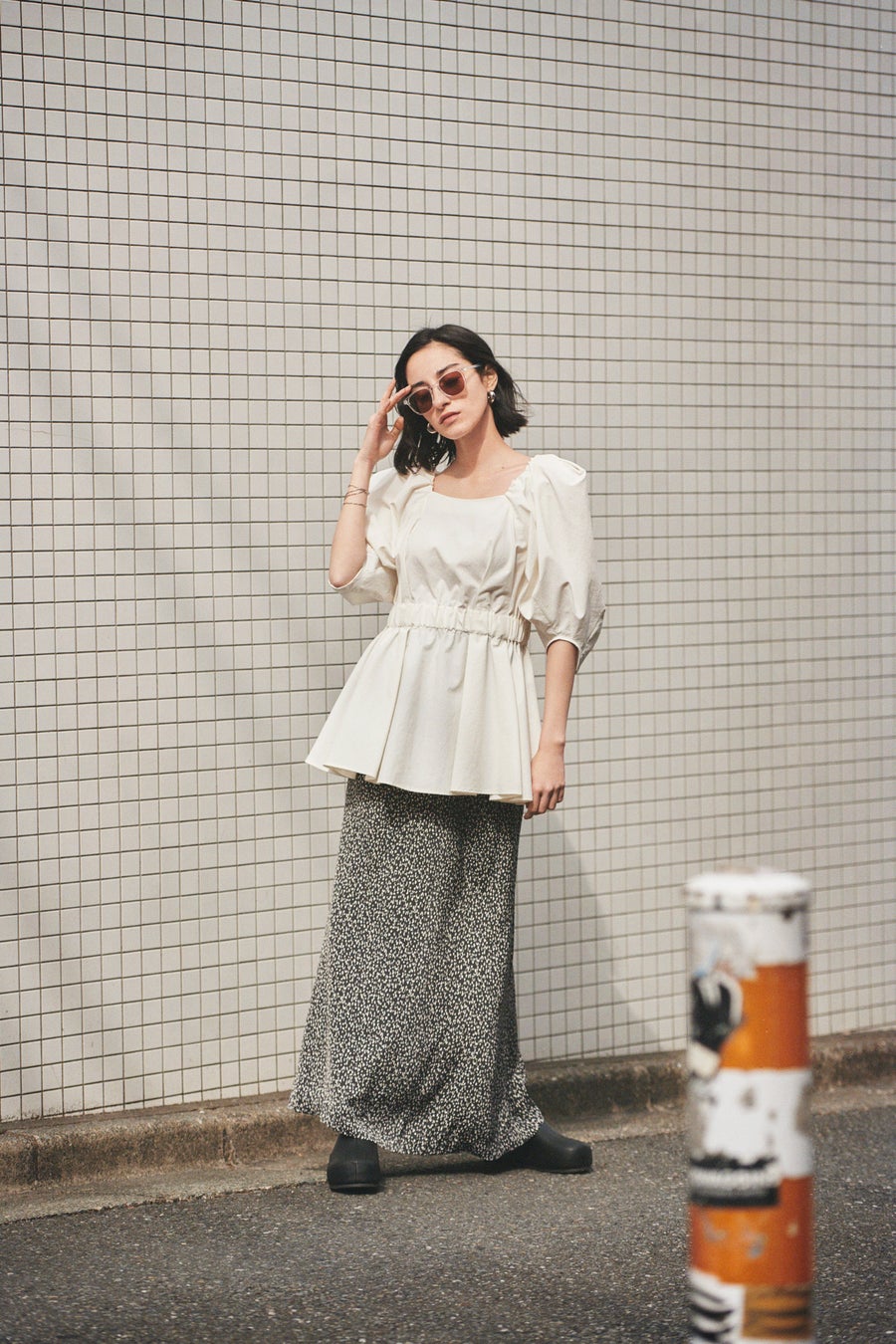 Blouse 16,500yen / Skirt 15,400yen / Sandals 13,200yen / Pierced earrings 3,960yen