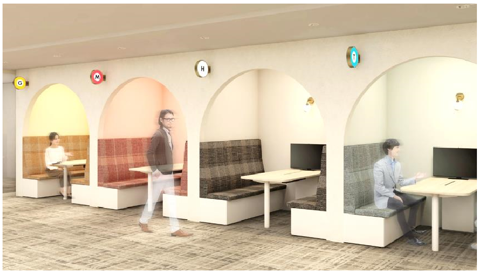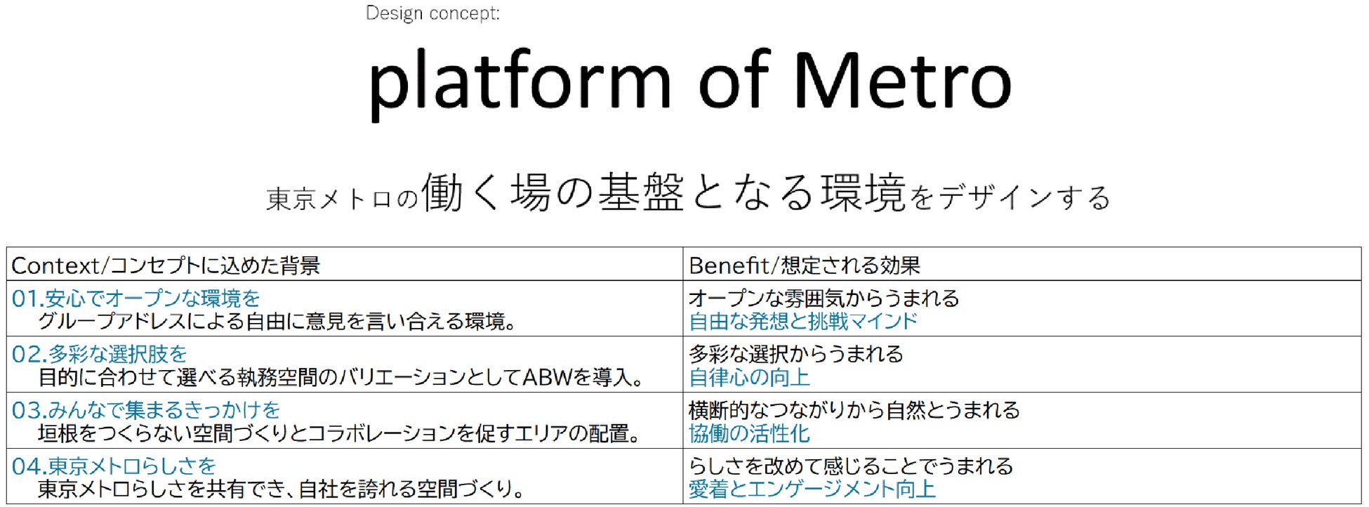 新オフィスでは、 「自由な発想で挑戦」し「横断連携による価値創造」を促す環境と「社員エンゲージメントが高まる」オフィスを目指して、「platform of Metro」をデザインコンセプトに、東京メトロの働く場の基盤となる環境を実現します。