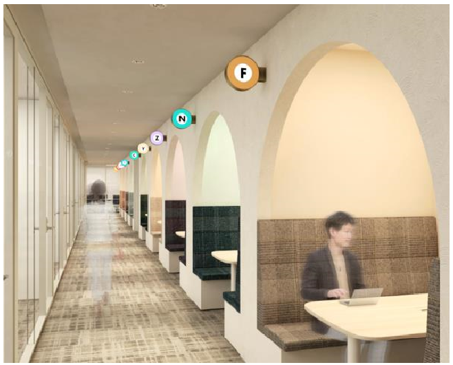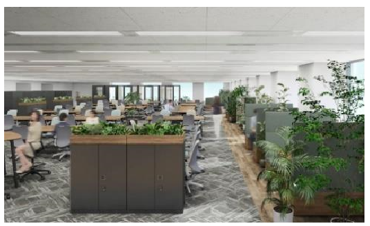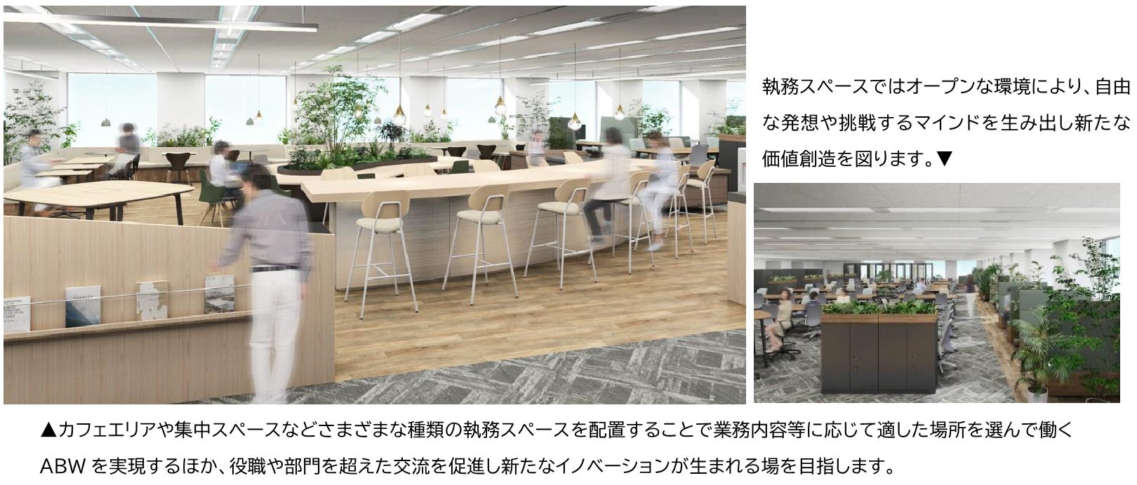 新オフィスでは「自由な発想で挑戦」し「横断連携による価値創造」を促す環境と「社員エンゲージメントが高まる」空間を目指し、ユニバーサルデザインを取り入れ、緑が多く部署間コミュニケーションを促すオフィス環境と、業務内容やプロジェクトに応じて働く場所を選べるABW※を実現します。