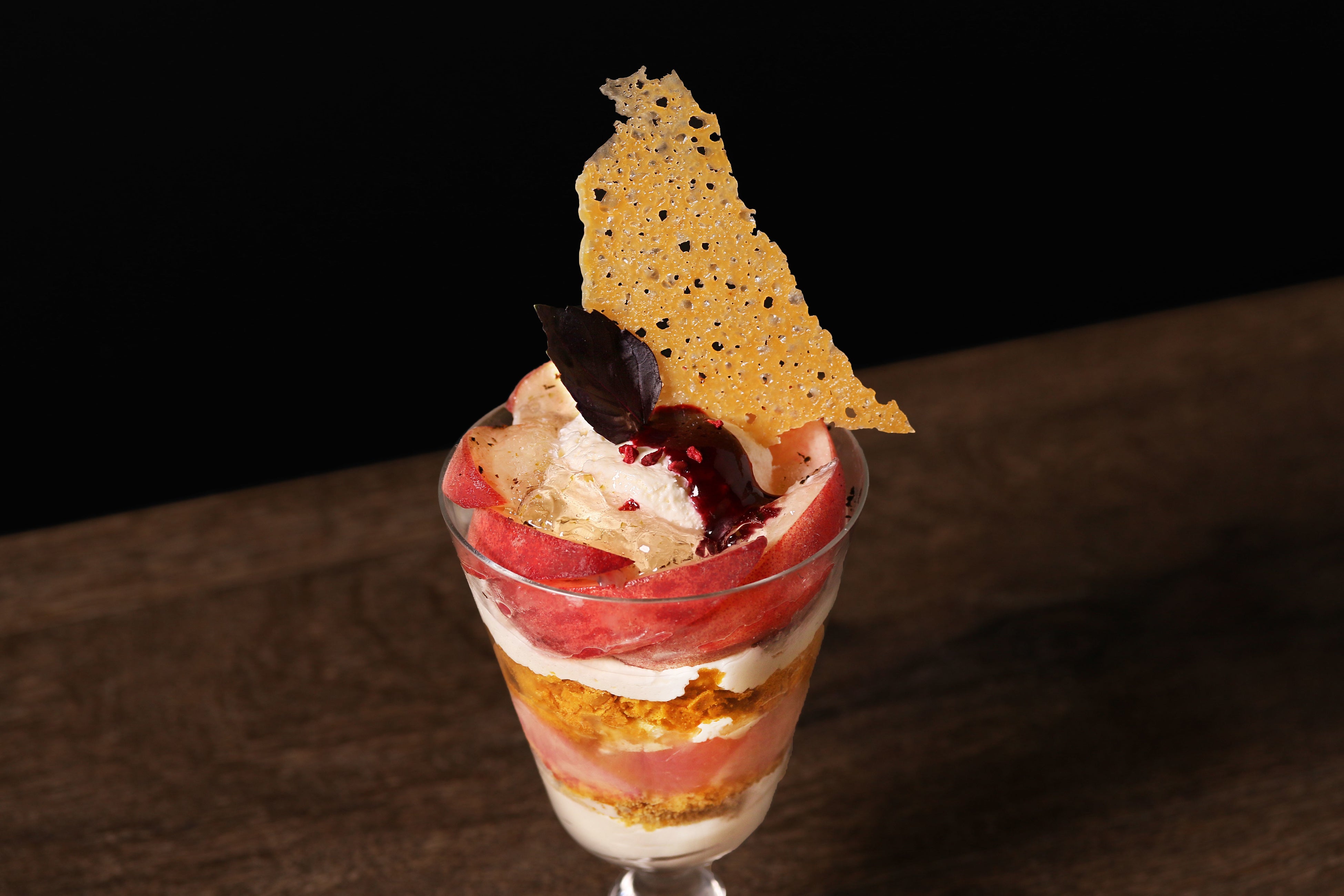 アールグレイの茶葉を纏ったとろっと甘い桃果実に、自家製のアプリコットパウンドケーキやレモンムースなどこだわりのスイーツをグラスの中に。