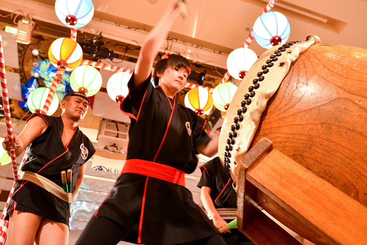 ホテルの大宴会場に組んだまつり櫓(やぐら)の周りで、迫力の太鼓の音に合わせて盆踊り。初めての方もお楽しみいただけるよう日本民踊の講師による踊り方の練習会も設けます。