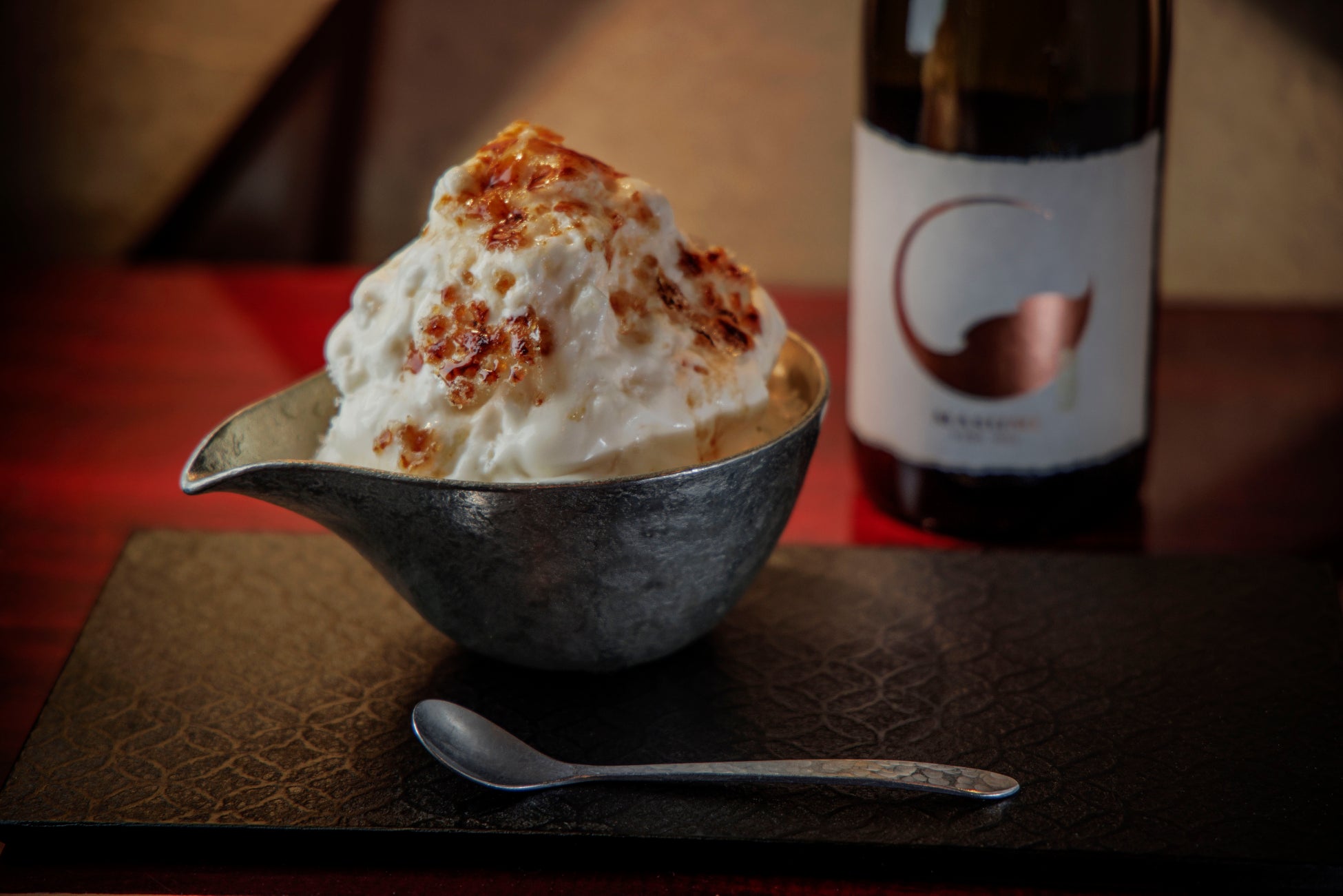発酵文化の盛んな信州ならではの、酒粕を使用した芳醇で濃厚なかき氷です。酒蔵・宮坂醸造(長野県)の「真澄 純米大吟醸 山花」の酒粕は、市場には出回らない、星のや軽井沢限定で特別に仕入れたものです。香り高い酒粕と甘酒を合わせた「吟醸アイス」や、蕎麦の実を発酵させた「蕎麦糀」を閉じ込めた氷に、酒粕やヨーグルト、マスカルポーネを使用したクリームをかけます。日本酒由来の芳醇な香りと甘酒や蕎麦糀など信州の発酵文化の恵みが織りなす、奥深い味わいが特徴です。