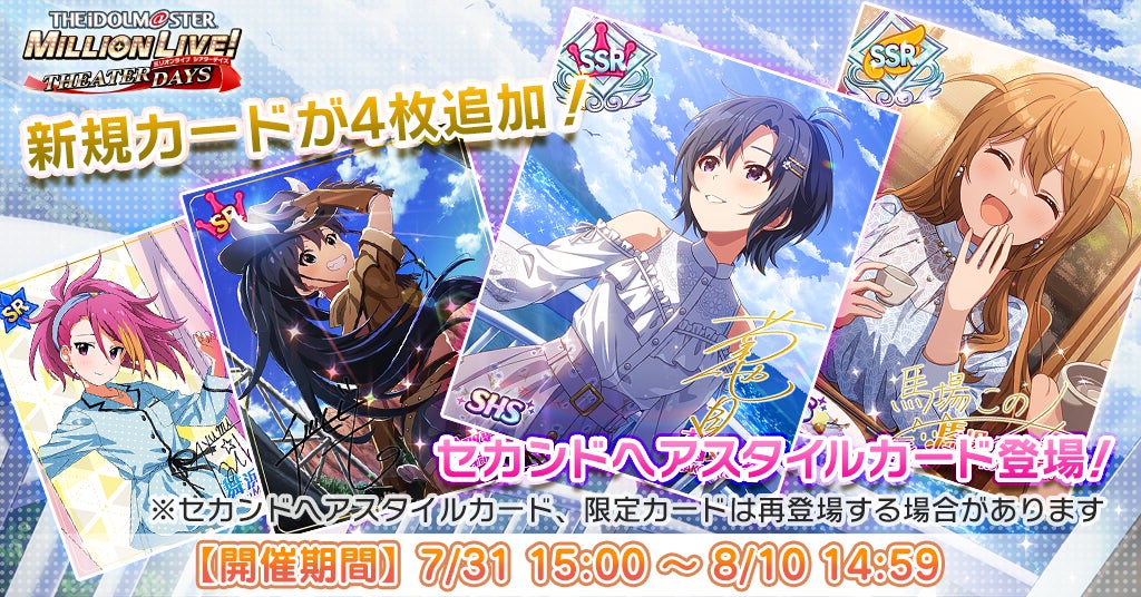 新規追加のセカンドヘアスタイルカードは、アイドルを新しい髪型「セカンドヘアスタイル」で登場させられるようになるカードとなり、専用衣装はライブだけでなく事前に設定することで、劇場やコミュにもアイドルの私服として登場する衣装となりますので、ぜひご確認ください。