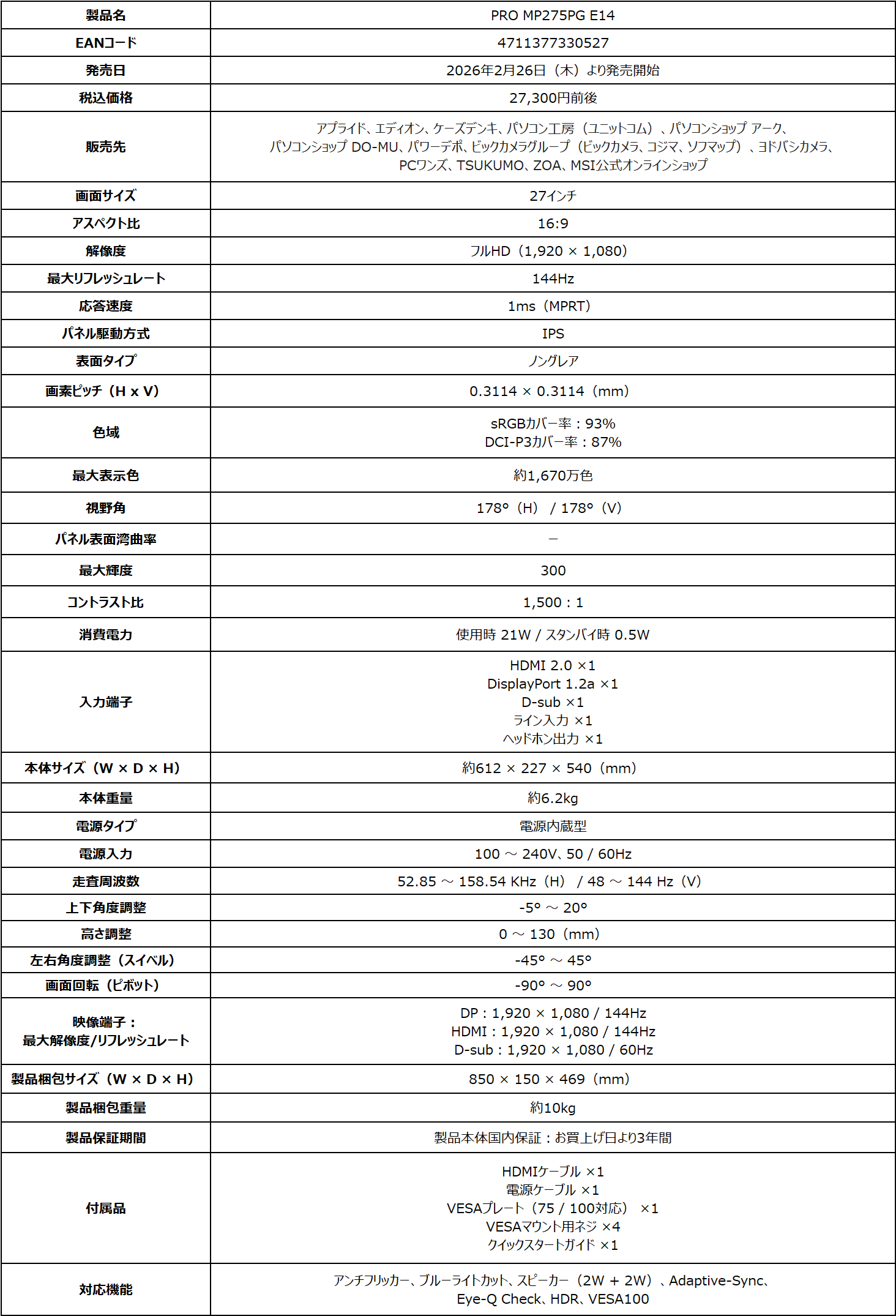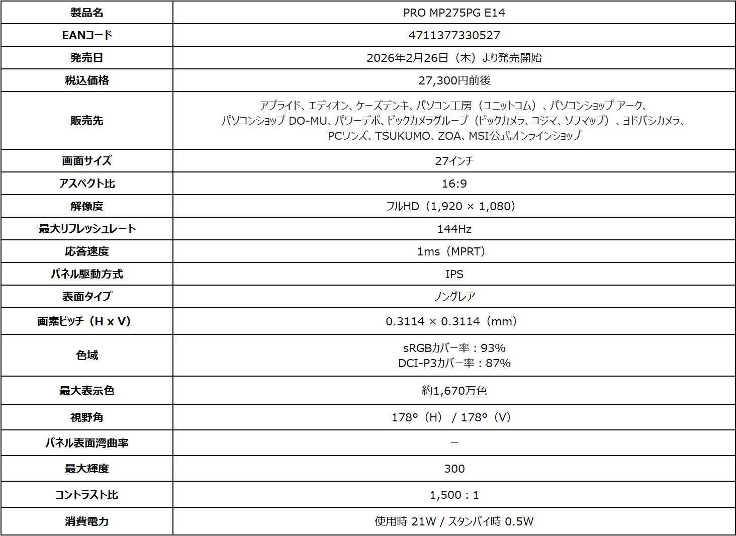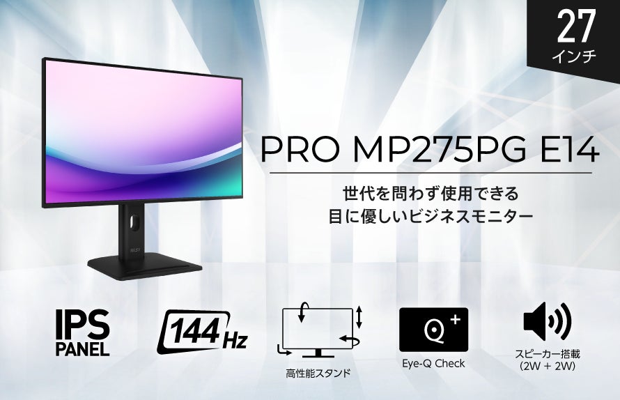 この度、エムエスアイコンピュータージャパン株式会社は2026年2月26日(木)より、ビジネス向けモニターの新モデルを発売いたします。大きな画面で見やすい27インチ、リフレッシュレート144Hz表示に対応した高画質IPSパネル、高性能スタンドやスピーカー、対応したPCとの電源連動など多彩な機能を備え、効率的なワークスペース構築を支援するビジネスモニター「PRO MP275PG E14」が新たにラインナップに加わります。