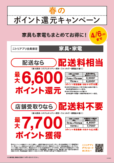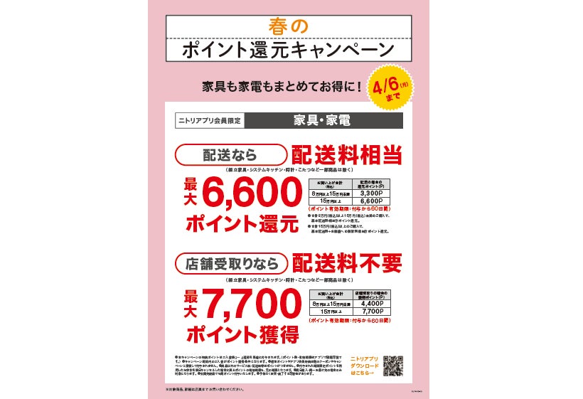 お客さまの春の生活のスタートを応援するべく、今回、ニトリアプリ会員様限定で、配送・店舗受取りいずれの受取り方法でもお得にご利用いただけるポイント還元企画を実施いたします。