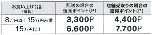 対象商品合計8万円(税込)以上15万円(税込)未満のご購入:3,300ポイント(基本配送料相当分)