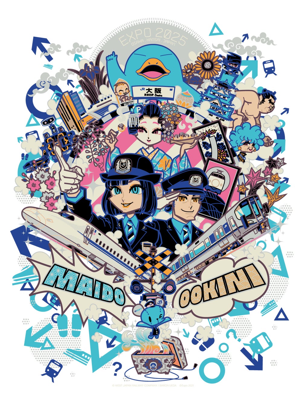 会場内オフィシャルストアの制服デザインを作成するにあたり、京都出身の人気アーティストである上田バロン氏とのコラボイラストを作成しました。本イラストは「JR西日本らしさ」に加え、大阪・関西・日本のモチーフを活用し、JR西日本グループが一体となって万博へ向かっていくエネルギーを表現しています。