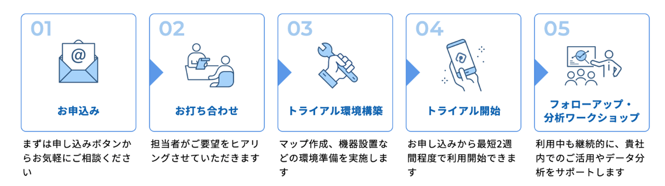 トライアルで蓄積されたデータより、会議室・座席の予約率や使用率、ピークタイムの把握や分析ができ、そのまま本導入に進めることも可能です。