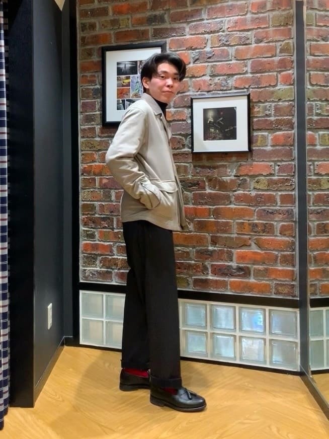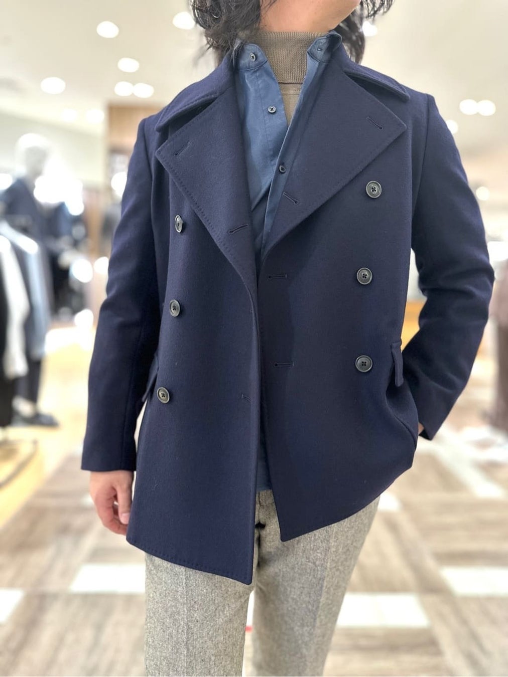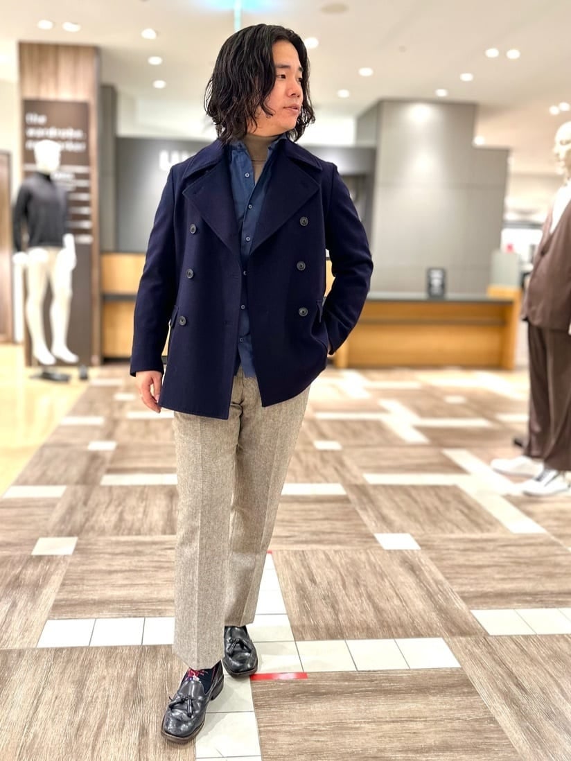 ニューヨーカーメルトンシリーズからミドルタイプで作り上げたピーコートでカジュアルコーディネート。これが見た目以上に軽い!!シャンブレーシャツとタートルネックのレイヤードスタイルに軽く羽織るスタイリングにしました。コテっとした合わせも素敵ですが、今回はあえてシンプルに且つ洒落感ある着こなしでこなれ感を出してみました。