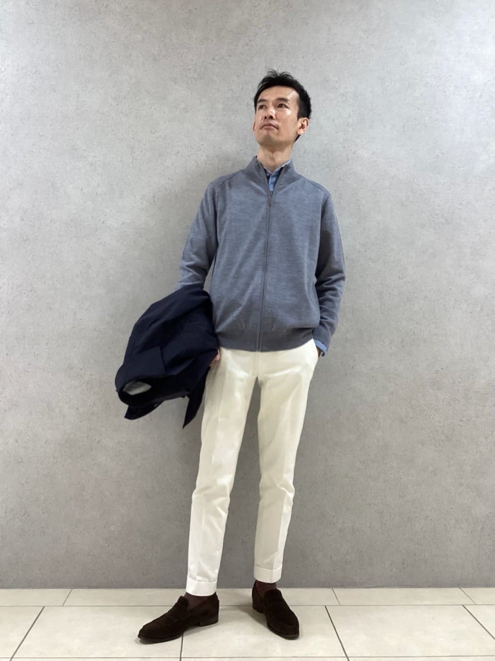 ミリタリーテイストのアウターをモノトーンカラーで都会的にコーディネートしました。インナーにはシャツとカーディガンをレイヤード。アウターは軽量性に優れた素材でインナー次第で長い期間着用出来ます。中に合わせたグレーのジップアップカーディガンも様々なコーディネートに馴染む一押しアイテムです。