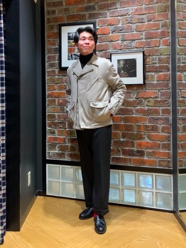 ライダースをシックに着こなしたスタイリング。中綿の入った防寒性もあるライダース、カッコ良さと暖かさを兼ね備えています。ボトムスは上品な光沢のあるスラックスを合わせました。ややワイドなシルエットが新鮮でかっこよくお洒落な印象です!インナーはシンプルにタートルネック、アウター以外をダークカラーでまとめた手軽でこなれたコーディネートです。