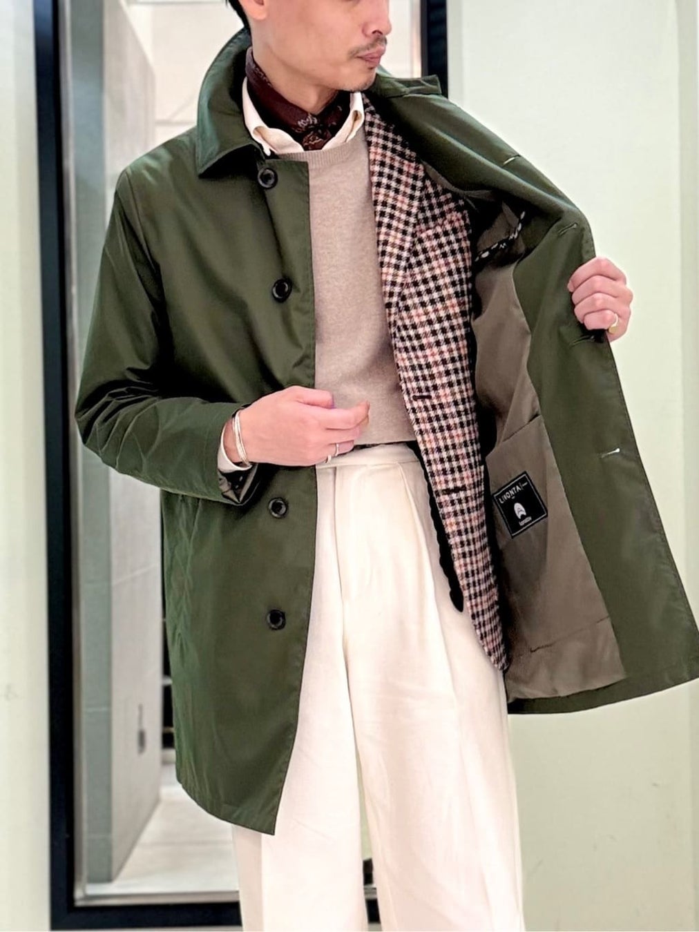 リッチな雰囲気のある伊LIMONTA社のナイロン生地を使用したステンカラーコートをカジュアルに。コーディネートの色数は抑えてコートを主役に引き立ててみました。薄手で長期間着用し易いナイロンコートは、気取らずラフに羽織っていただきたい1着です。コートから覗くパターンオーダーのチェック柄ジャケットもポイントです。