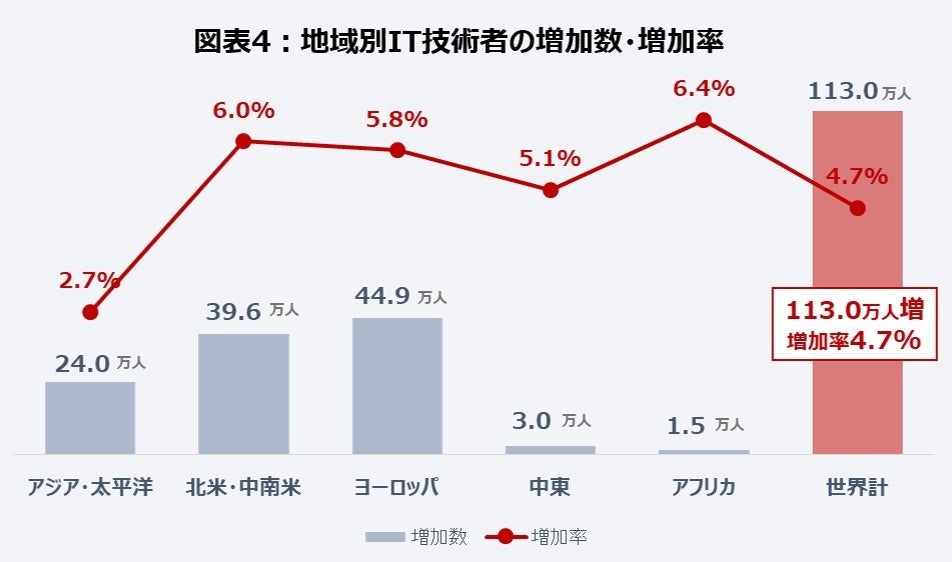 続いて、各国のIT技術者数の最新データと、データを収集できた直近の前年と比較したところ(※3)、世界全体で、IT技術者数は約113万人増加しており、前年比4.7%増加していることがわかりました。また全ての地域でIT技術者が増えています(図表4)。