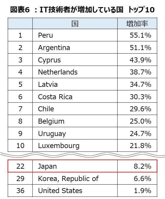続いてIT技術者の増加率を国別にみると(※4)、1位は55.1%増加したペルー、2位に51.1%増のアルゼンチン、3位は43.9%増のキプロスが入りました。その他中南米地域では、コスタリカ、チリ、ウルグアイがランクイン、ヨーロッパも計5カ国がランクインし、中南米とヨーロッパがトップ10を占めました(図表6)。