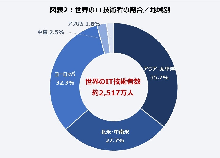 続いて、世界のIT技術者数の地域別占有率では、世界のIT技術者の35.7%をアジア・太平洋地域が占めています。なお米国を含む北米・中南米地域が27.7%、ヨーロッパ地域が32.3%となりました(図表2)。