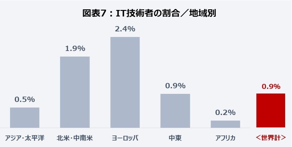就業者のうちIT技術者が占める割合を算出したところ、109カ国全体では、0.9%となりました。地域別にみてみると、就業者のうち最もIT技術者の割合が高いのは、2.4%のヨーロッパとなり、北米・中南米地域が1.9%と続きました(図表7)。IT技術者数が最も多いアジア・太平洋地域では、IT技術者の割合は0.5%で、世界平均より低い結果となりました。なお、2021年調査までは各国の総人口に占める割合を算出していましたが、本調査では、各国の就業者数に占めるIT技術者の割合を算出しています。
