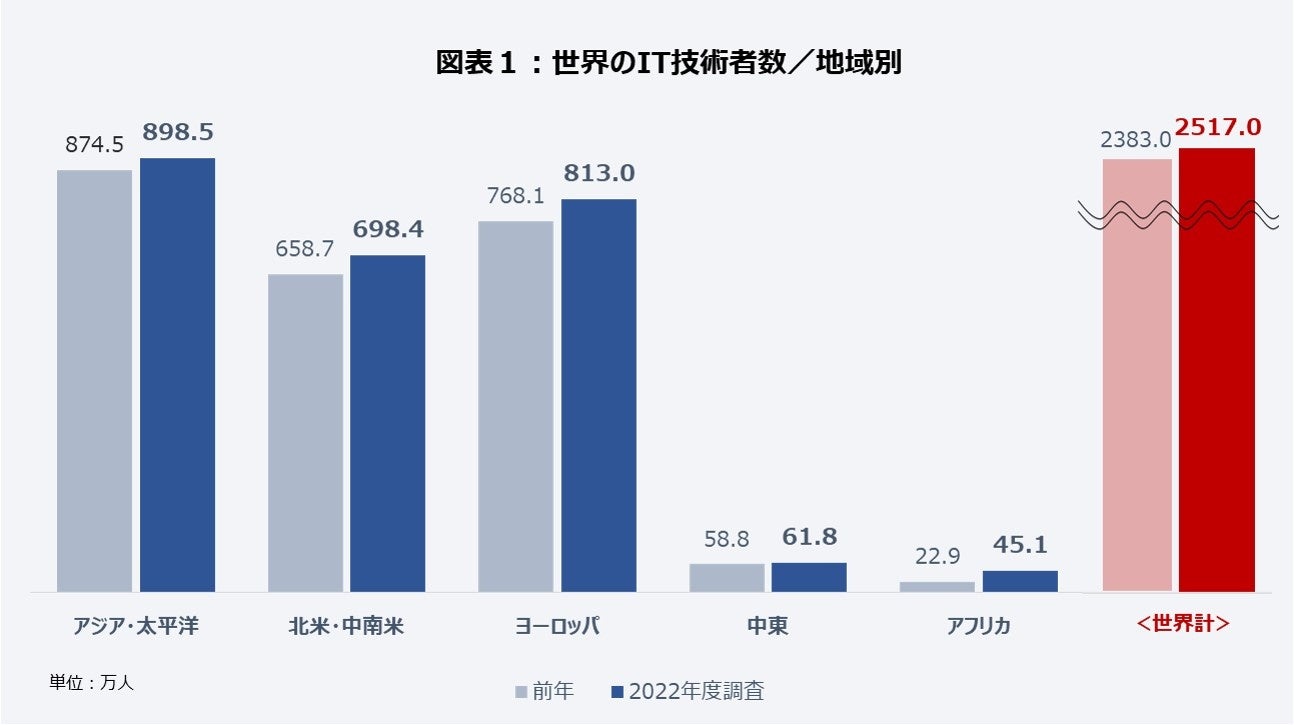 世界109カ国のIT技術者数は、推計2,517万人となりました。中国やインドなどIT技術者輩出国を擁するアジア・太平洋地域で898.5万人、米国を含む北米・中南米で698.4万人、そしてヨーロッパは813.0万人となりました(図表1)。