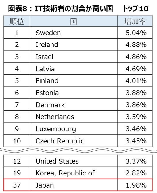 一方、IT技術者の増加数で3位となった日本は8.2%増で、増加率は22位にとどまりました。またIT技術者数で1位の米国は1.9%増の36位となりました。