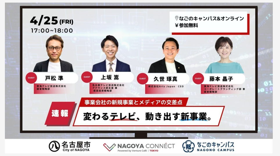 4月25日(金)にNAGOYA CONNÉCTが開催する「事業会社の新規事業とメディアの交差点~変わるテレビ、動き出す新事業。~」にメ~テレ上坂嵩アナウンサーが登壇します。変わりゆく時代の中でのテレビ局の取り組みをお届けします。是非ご参加ください。
