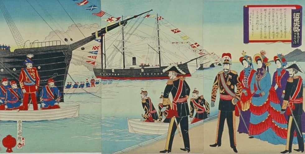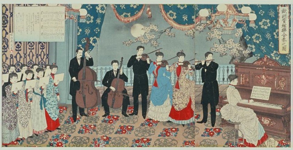 ガス燈が横浜や東京の街に灯り始めた文明開化の頃、街では洋装を纏う人々の姿が見られるようになりました。男性の洋装を中心に、皇族や上流階級の女性の間で洋装が広まり、それは欧米諸国に日本の西洋化を示す外交的な意味合いもありました。